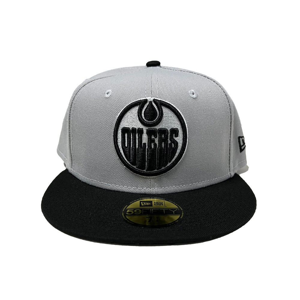 This Edmonton Oilers New Era 59FIFTY Fitted Grey & Black Oilers Hat features a white and black Oilers logo with the Edmonton Oilers wordmark embroidered on the back of the cap.
