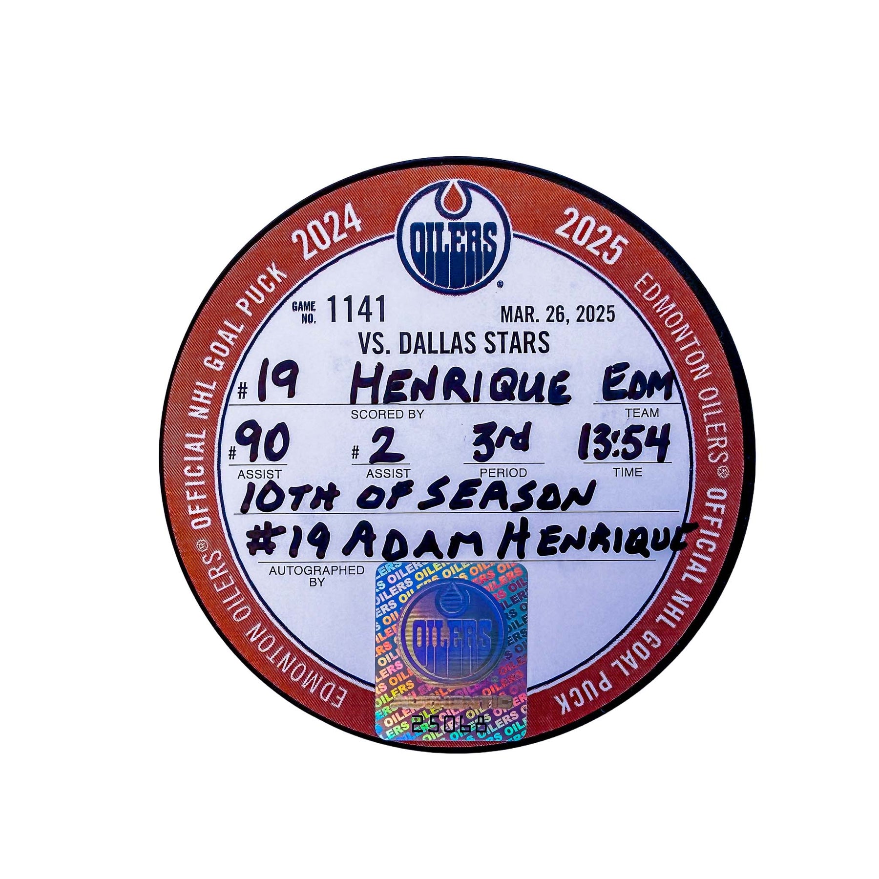 Adam Henrique Edmonton Oilers Autographed Goal Puck - Mar. 26/2025 vs Dallas Stars #25068