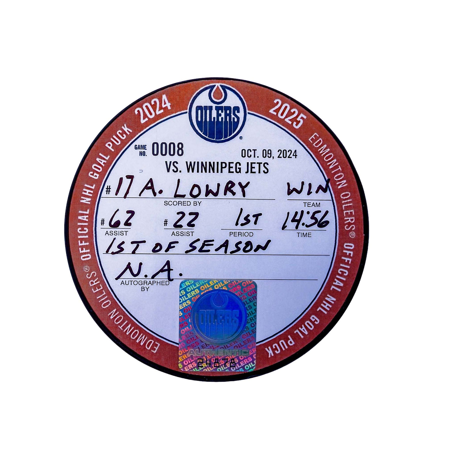 Adam Lowry Winnipeg Jets Goal Puck - Oct. 9/2024 vs Edmonton Oilers #24878