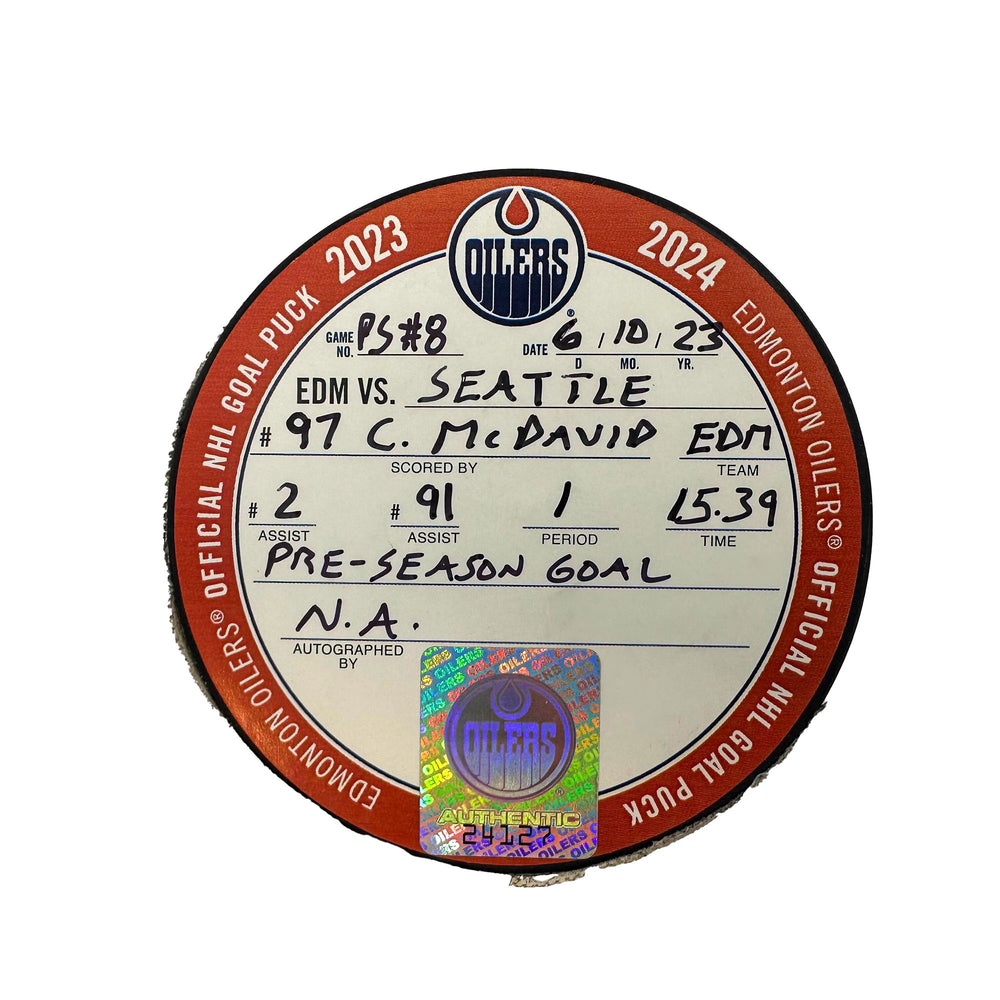 Connor McDavid Edmonton Oilers Preseason Goal Puck - Oct. 6/2023 vs Seattle Kraken #24127