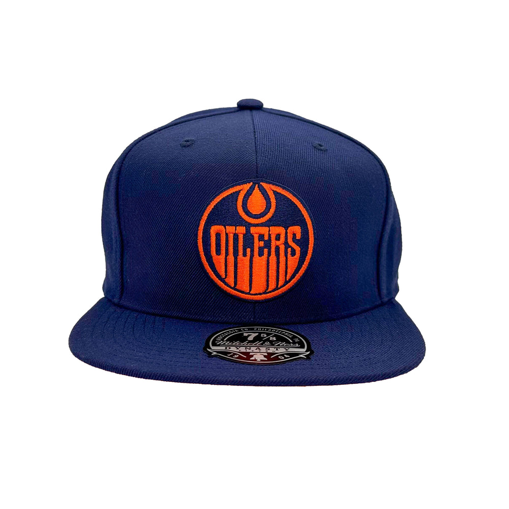 Introducing the Edmonton Oilers Mitchell & Ness Navy Alternate Logo Fitted Hat. This hat features the iconic Oilers logo, perfect for any fan. Stay stylish and show off your team pride with this fitted hat.