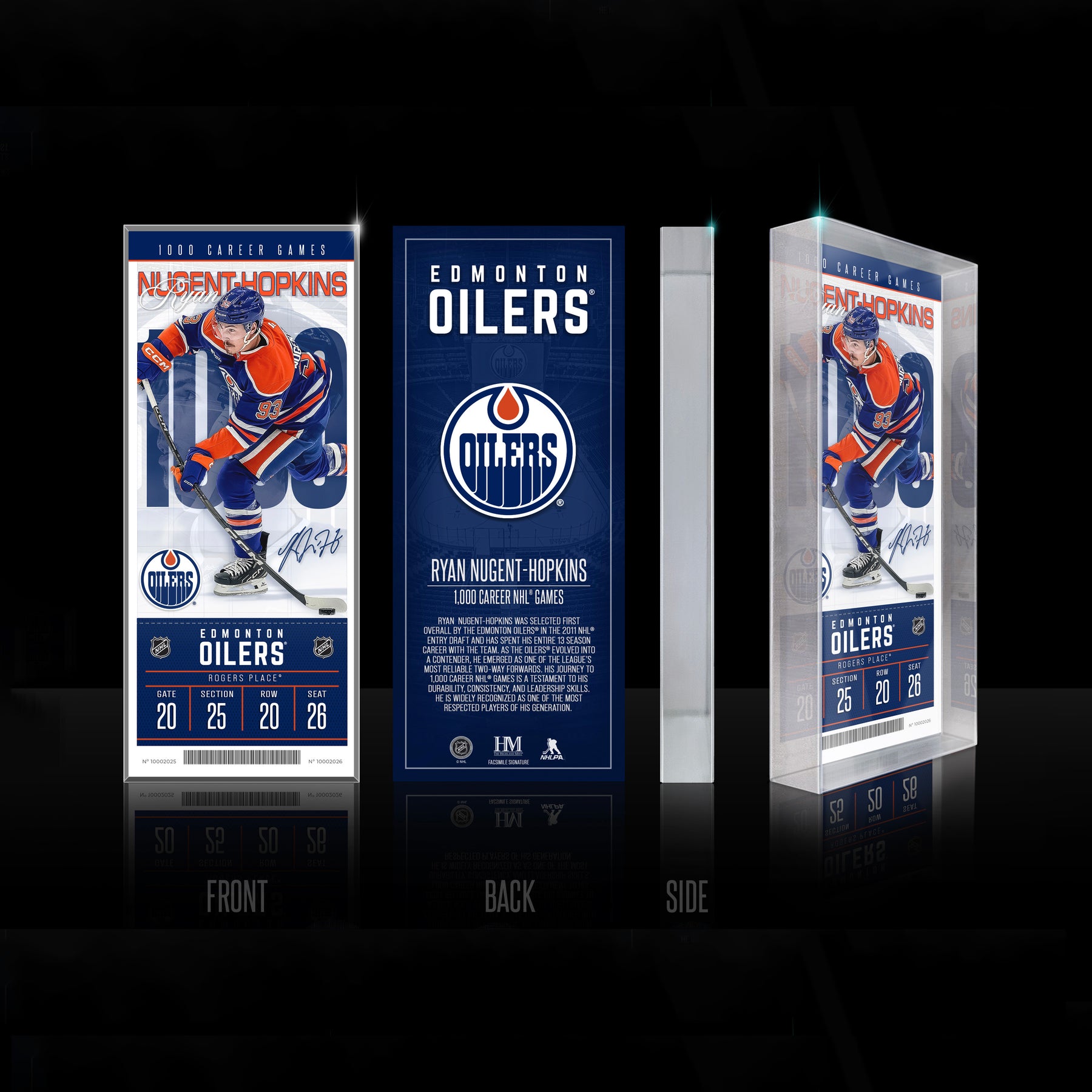 Celebrate Ryan Nugent-Hopkins' 1000th career game, this premium 3D Acrylic Ticket BlocKart collectible. Encased in a sleek 3/4"-thick acrylic block, it showcases a commemorative ticket honoring Ryan Nugent-Hopkins. Measuring 2.5" x 6", this freestanding display also features a detailed team history highlighting milestone achievements and championship triumphs from the franchise’s legendary legacy.