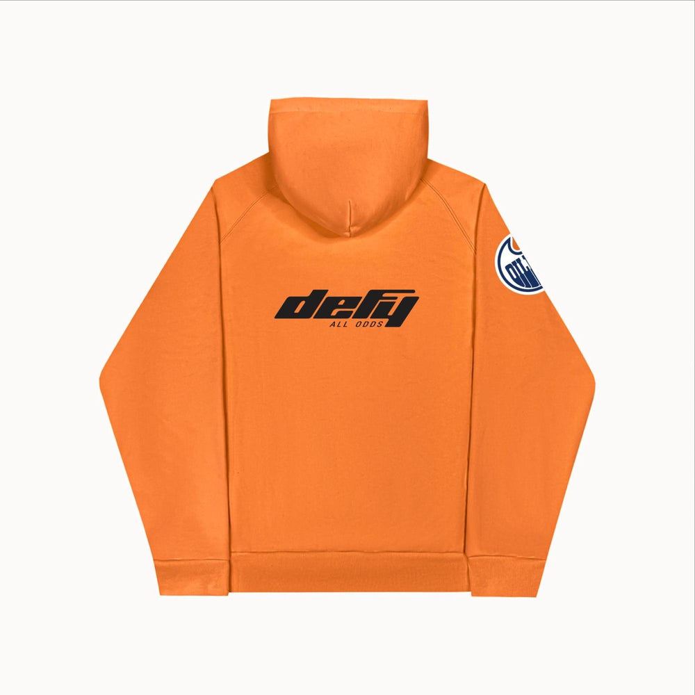 Defy All Odds. Oversized fit logo hoodie featuring puff printed 'Oilers' logo on the arm. Constructed with a heavyweight luxe cotton/polyester blend fabric, kangaroo pouch, and premium ribbing.