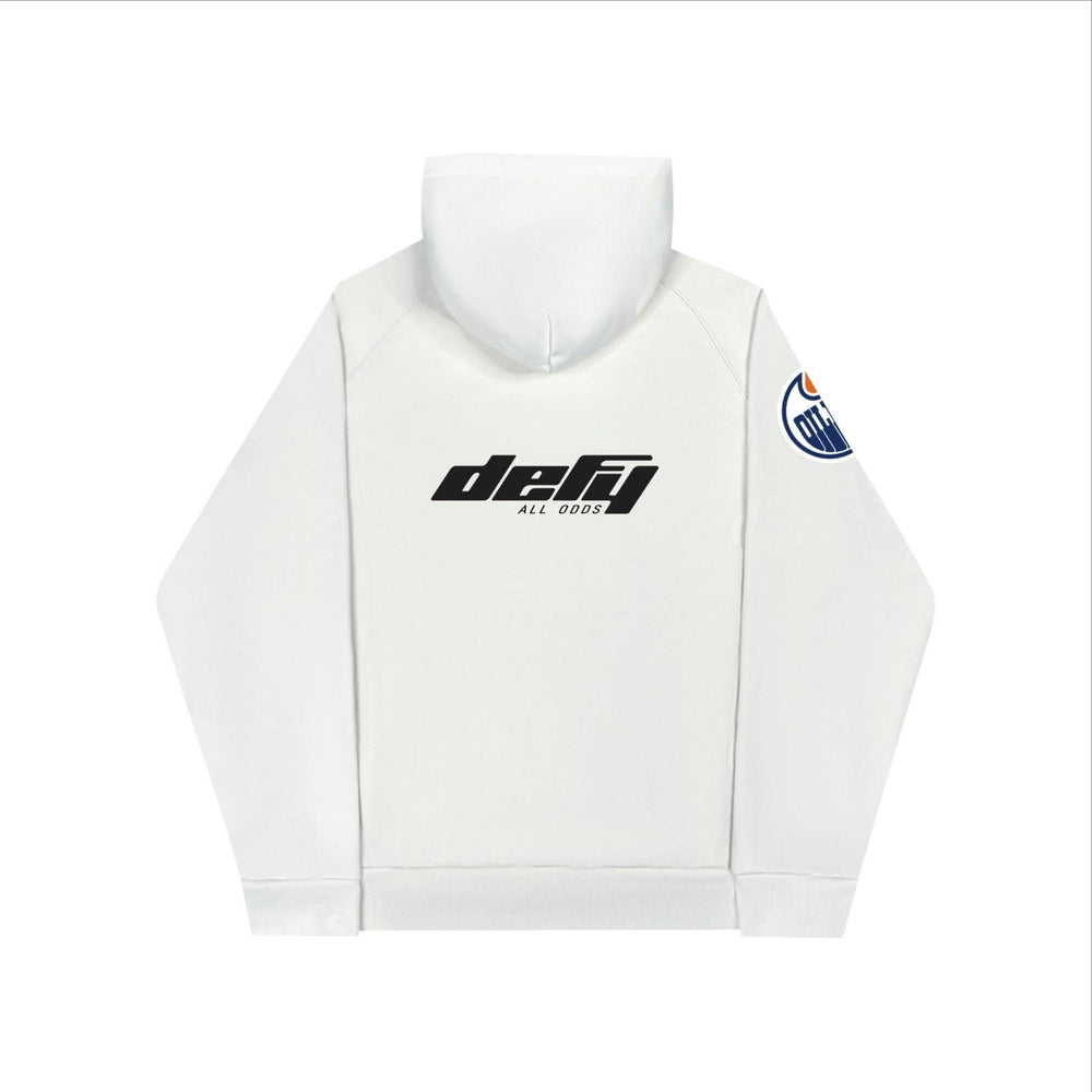 Defy All Odds. Oversized fit logo hoodie featuring puff printed 'Oilers' logo on the arm. Constructed with a heavyweight luxe cotton/polyester blend fabric, kangaroo pouch, and premium ribbing.