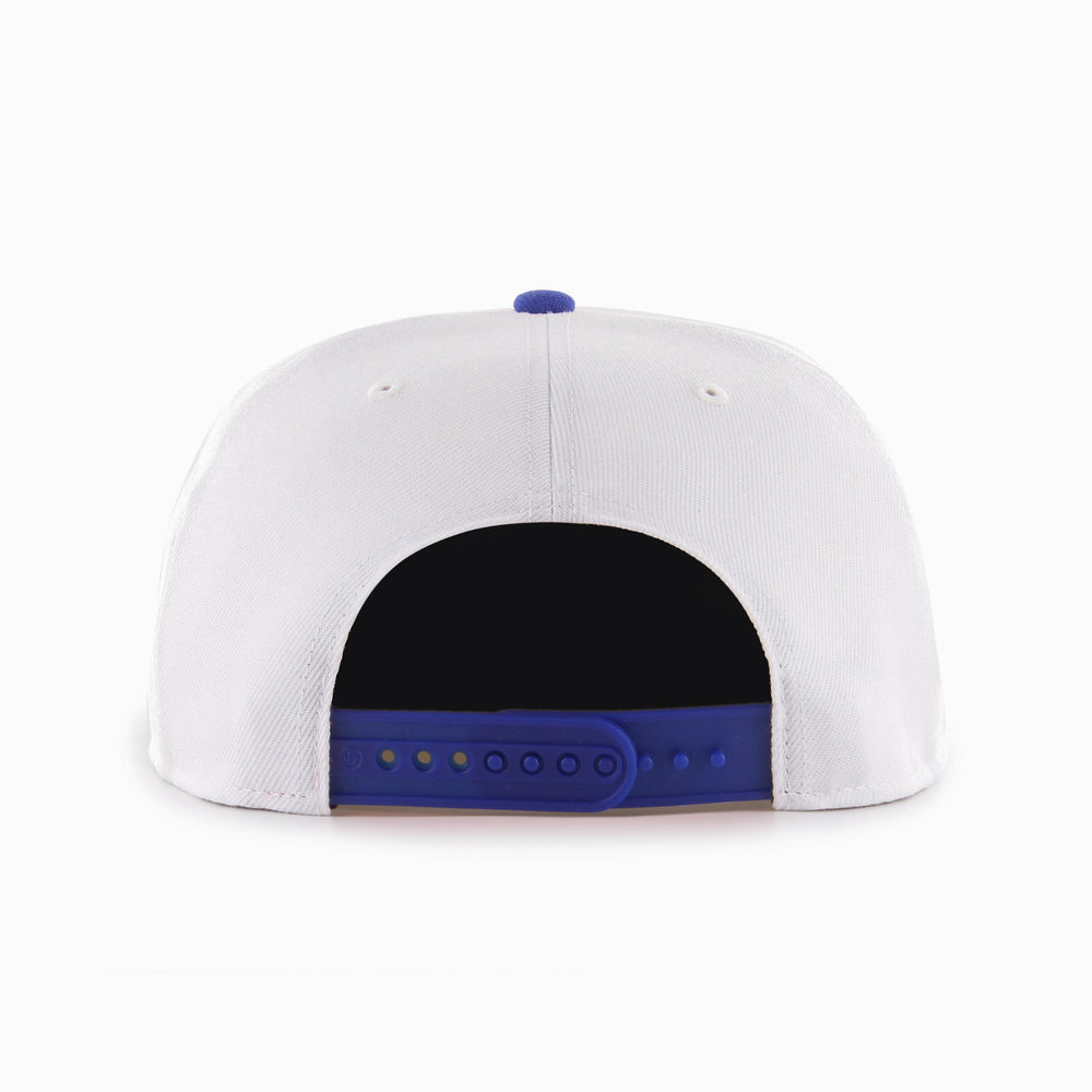 The Edmonton Oilers '47 White & Blue Corkscrew Snapback Hat is a structured, flat brim adjustable hat with an embroidered Oilers logo on the front.