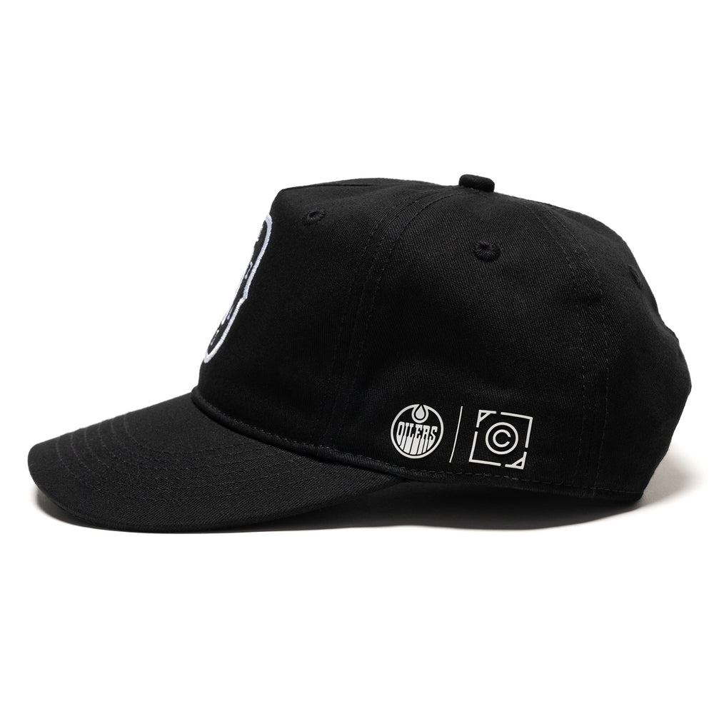 This classic 5 panel hat is made from cotton twill. It has an unstructured front panel to form to the shape of your head. The slanted mid-profile depth was designed to make it comfortable for women and men. A rear snapback closure completes the cap. Oilers graphic embroidered with felt to front, LSG x Oilers logo to left side, LSG x Oilers logo woven label sewn to inside sweat band. Designed in Edmonton.