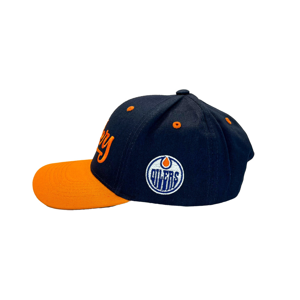 Lookin' for a wicked cool hat? Check out this Edmonton Oilers Sport Design Sweden Navy & Orange Script Baseball Snapback Hat! It's fresh, fun, and sure to make you stand out. Don't miss out on reppin' your favorite team with this snazzy snapback.