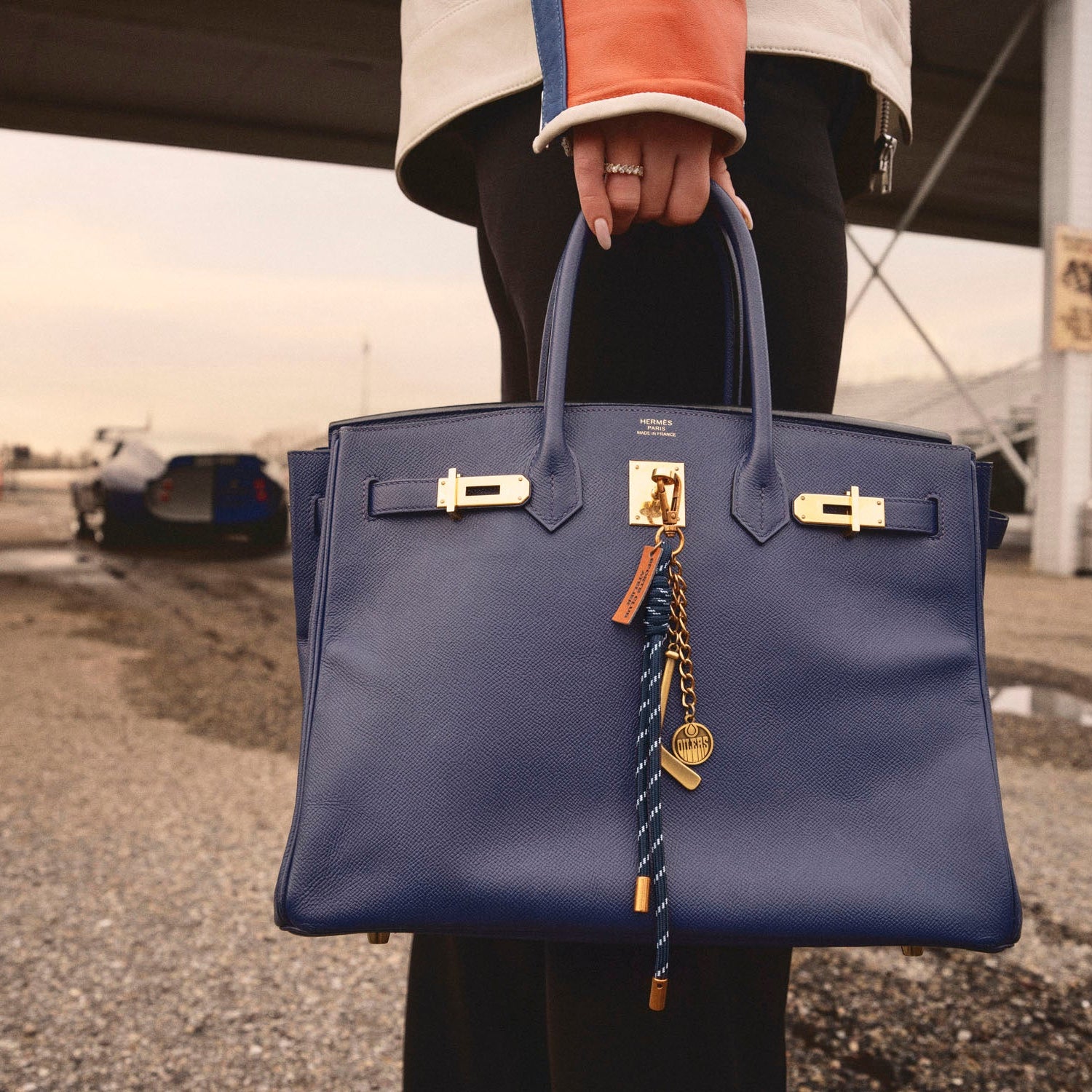The Oil Drop key chain/ Bag Clip transforms utility into statement. Designed in Brass metal with bungee cord accents, it’s finished with a brass hockey stick charm and an Oilers insignia. Equal parts object and accessory, it clips seamlessly to bags or outerwear, bringing refined sport influence into modern everyday wear.
