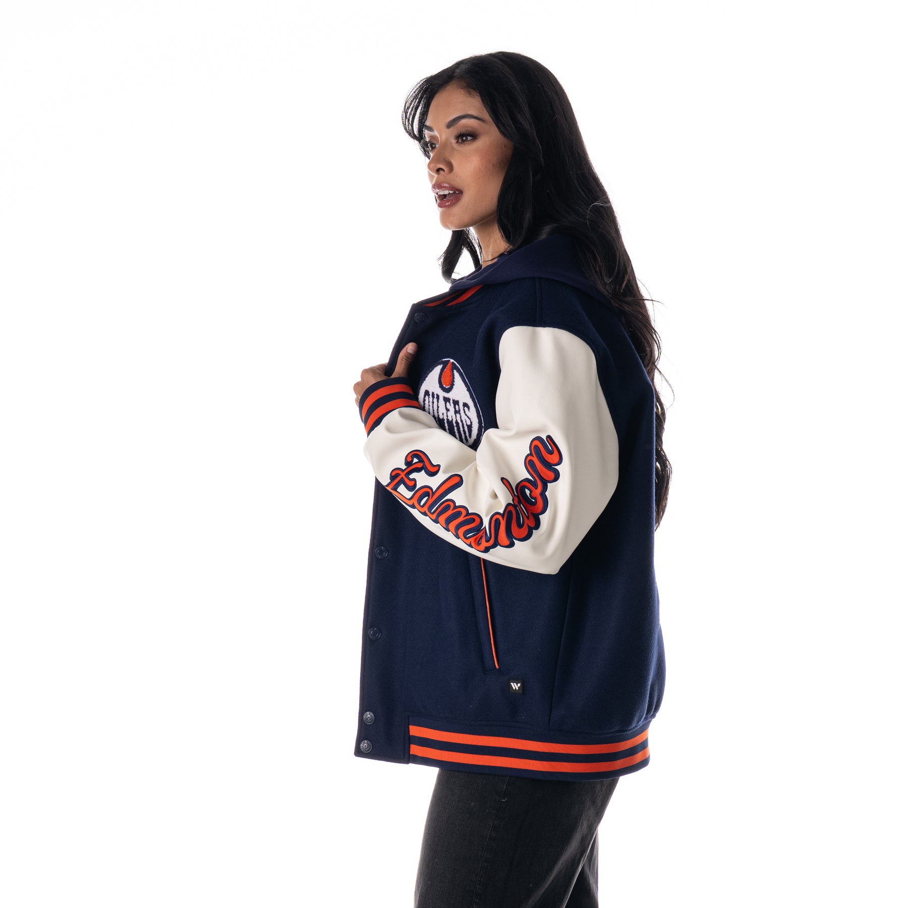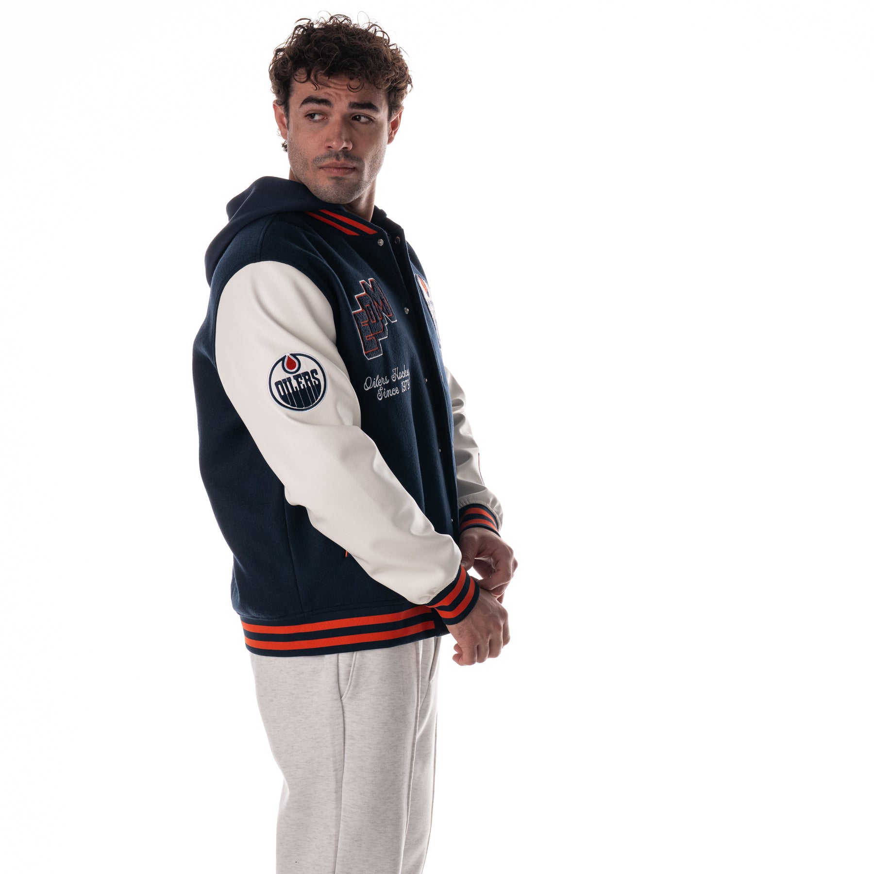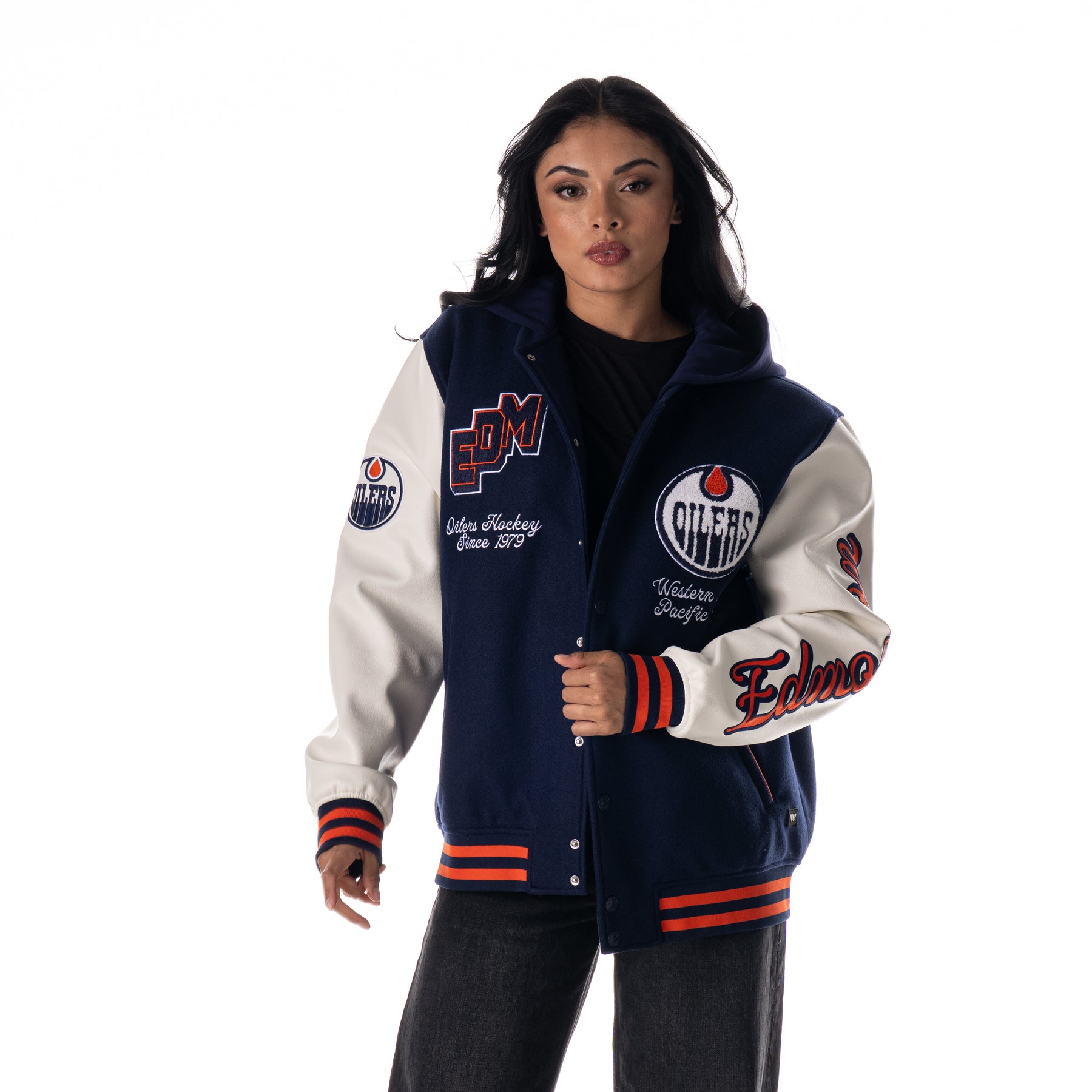 Rep one of hockey's most iconic teams in a varsity jacket that delivers all the attitude. This Edmonton Oilers Hooded Varsity Jacket brings a standout mix of throwback style and bold embroidered graphics, from the oversized Oilers logo on the back to the “Edmonton” hit down the sleeve. The two-tone design features a soft black wool body with contrast faux leather sleeves and bold orange-and-navy ribbed trim. Finished with signature varsity chenille patches, snap-button front for layered styling.